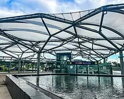 The translucent entrance canopy and the large CCL entrance are intended to maximise the amount of natural light entering the station.[71] Only the lift, escalators, the lightweight ETFE canopy and the reflective pool are visible from street level; this reduces the station's aesthetic impact on the park's landscape while giving passengers a full view of the park from the station entrance. The reflective pool was also intended to provide a smooth transition between the exits and the park.[67]