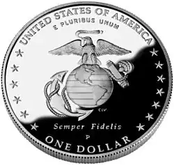 | Design | Eagle, Globe and Anchor — the Marine Corps Emblem, thirteen stars. Inscriptions — "Semper Fidelis" (the Marine Corps Motto), "United States of America," "E Pluribus Unum," "One Dollar." |