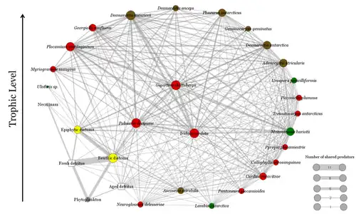 - ^ a b Cordone, Georgina; Marina, Tomás I.; Salinas, Vanesa; Doyle, Santiago R.; Saravia, Leonardo A.; Momo, Fernando R. (2018). "Effects of macroalgae loss in an Antarctic marine food web: Applying extinction thresholds to food web studies". PeerJ. 6 e5531. doi:10.7717/peerj.5531. PMC 6139014. PMID 30225167.