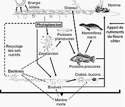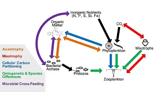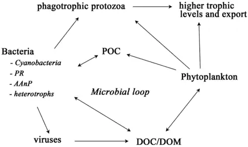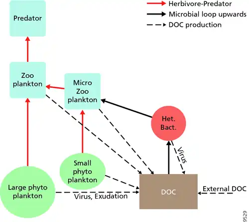 For pelagic ecosystems, Legendre and Rassoulzadagan proposed in 1995 a continuum of trophic pathways with the herbivorous food-chain and microbial loop as food-web end members.[55] The classical linear food-chain end-member involves grazing by zooplankton on larger phytoplankton and subsequent predation on zooplankton by either larger zooplankton or another predator. In such a linear food-chain a predator can either lead to high phytoplankton biomass (in a system with phytoplankton, herbivore and a predator) or reduced phytoplankton biomass (in a system with four levels). Changes in predator abundance can, thus, lead to trophic cascades.[56] The microbial loop end-member involves not only phytoplankton, as basal resource, but also dissolved organic carbon.[57] Dissolved organic carbon is used by heterotrophic bacteria for growth are predated upon by larger zooplankton. Consequently, dissolved organic carbon is transformed, via a bacterial-microzooplankton loop, to zooplankton. These two end-member carbon processing pathways are connected at multiple levels. Small phytoplankton can be consumed directly by microzooplankton.[54]