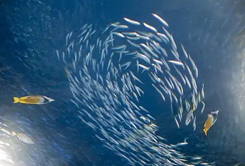 Ecosystems, even those with seemingly distinct borders, rarely function independently of other adjacent systems.[79] Ecologists are increasingly recognizing the important effects that cross-ecosystem transport of energy and nutrients have on plant and animal populations and communities.[80][81] A well known example of this is how seabirds concentrate marine-derived nutrients on breeding islands in the form of feces (guano) which contains ≈15–20% nitrogen (N), as well as 10% phosphorus.[82][83][84] These nutrients dramatically alter terrestrial ecosystem functioning and dynamics and can support increased primary and secondary productivity.[85][86] However, although many studies have demonstrated nitrogen enrichment of terrestrial components due to guano deposition across various taxonomic groups,[85][87][88][89] only a few have studied its retroaction on marine ecosystems and most of these studies were restricted to temperate regions and high nutrient waters.[82][90][91][92] In the tropics, coral reefs can be found adjacent to islands with large populations of breeding seabirds, and could be potentially affected by local nutrient enrichment due to the transport of seabird-derived nutrients in surrounding waters. Studies on the influence of guano on tropical marine ecosystems suggest nitrogen from guano enriches seawater and reef primary producers.[90][93][94]