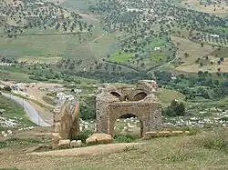 A royal necropolis eventually developed on this site, where some other tombs may have already existed as early as the 11th and 12th centuries (perhaps connected to the nearby Bab Guissa Cemetery).[5] According to the Rawd al-Qirtas, the founder of the Marinid dynasty, Abu Muhammad Abd al-Haqq I (d. 1217), was buried at Tafirtast, a site near Meknes and close to where he had fallen in battle.[6] Up until the middle of the 14th century the Marinid dynasty then buried its rulers in the royal necropolis at Chellah, just outside Rabat.[7] Sultan Abu Inan, however, was interred in the Grand Mosque of Fes el-Jdid upon his death in 1358 and after this his successors, starting with Ibrahim ibn Ali, were buried in the necropolis on the al-Qula hill next to the Marinid palace there.[7][8] (Only one of them was again buried at Chellah, which otherwise became abandoned.[7]) They continued to be interred on this hill between 1361 and 1398 and then again at the end of the dynasty in 1465, when Abd al-Haqq II was buried here.[7][5][8] Two Marinid stelae (tombstones) were discovered near this site in the 20th century: one belonged to a young princess called Zineb who died in 1335 and the other belonged to a high official named Abu Ali al-Nasir who died at beginning of the same century.[9][8] The two stelae are now kept at the Dar Batha Museum in Fes.[8]