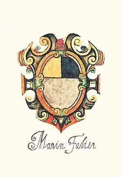 Marino Faliero was born c. 1274,[2] the son of Jacopo Faliero and Bettiola of the Loredan family.[3] Marino had three brothers, Ordelaffo, Marco, and Jacopo, and a sister, Francesca.[3] The Faliero family was one of the oldest in the Venetian patriciate; legend traced its origins to the myths surrounding the foundation of Venice itself in Late Antiquity. By the 14th century, it was counted among the twelve most prestigious, so-called "apostolic" noble families.[4]