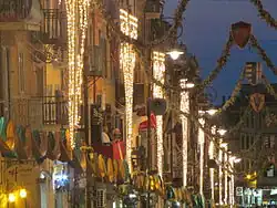 In 1945 the Gotto d'Oro Social Winery had been founded, which at the time had the name "Goccia d'Oro," changed later by analogy with an Apulian winery: from the 1948 Sagra the new institution began to collaborate actively in the organization of the event, distributing wine from the semi-destroyed Four Moors fountain.[19] On the occasion of the 1949 Sagra the scenic arched illuminations located along Corso Trieste made their first appearance.[19]