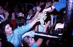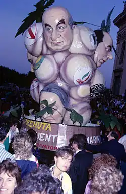 The concert of the 1973 edition featured Ricchi e Poveri and Pippo Baudo, and the parade of the historical procession was also held exceptionally in the hamlets of Frattocchie and Santa Maria delle Mole, which were in constant urban growth.[26] The fiftieth anniversary of the Sagra, on Sunday, October 6, 1974, went almost unnoticed because of the crisis Marino had fallen into after the separation of the hamlet of Ciampino, which became an autonomous municipality in July: the organization of the event had reverted to the Pro Loco. The floats also paraded through the streets of the hamlets.[26]
