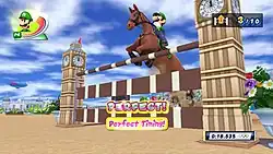 The Wii version features a total of 30 Olympic events,[12] including football, badminton, horse riding, canoeing, and volleyball. Re-imagined versions of previously existing events such as athletics, aquatics, and table tennis also appear.[11][13] The game introduces new cooperative mechanics including "Dream Events", alternate versions of Olympic events that take place in locations from previous games of the Mario and Sonic series,[14] and a challenge mode, which enables players to repeat complete challenges in various events.[15] "London Party" mode takes place on a board game-like depiction of London in which four players may compete in various sporting events and minigames. The ultimate objective is to collect enough stickers to fill up a "tourist book" – the player who completes the book first wins.[16][17] Upon the completion of any event, players earn scratch cards which can be redeemed in the game's "Bonus Mode" for rewards such as Mii costumes and additional music.[17] Unlike Mario & Sonic at the Olympic Winter Games, the Wii version of Mario & Sonic at the London 2012 Olympic Games does not support the Balance Board.[18][5]