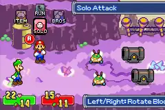 Similar to previous Mario role-playing titles, such as Super Mario RPG and the Paper Mario series, players can time button presses to make their attacks more effective, such as earning an extra jump attack or increasing the hammer's power.[9] Introduced in this series is the way in which Mario and Luigi can defend themselves during an enemy's attack. When an enemy attacks, the brothers can either jump or use their hammer which, when successfully timed, allows them to dodge their attacks and even deal counter damage (for example: if they jump on top of a charging Goomba).