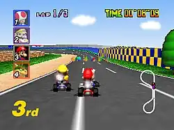 The game was provisionally titled Super Mario Kart R during development—the "R" being short for "rendered".[12][13] Mario Kart 64 was developed concurrently with Super Mario 64 (1996) and The Legend of Zelda: Ocarina of Time (1998) by Nintendo's Entertainment Analysis & Development division.[14] The game was revealed alongside the N64 console itself in November 1995 at the Shoshinkai trade show via a videotape given out to journalists.[12] The game was reportedly considered "95% complete" at the time of the show.[15] Mario Kart 64 was intended to be released alongside the N64 itself in mid-1996 but was delayed after development resources were directed towards Super Mario 64, itself a launch title for the system.[15][16]
