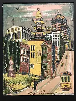 Cunningham began creating serigraphs in the 1930s. A recurring subject were cable car scenes. She was a member of the National Serigraph Society, the San Francisco Art Association, and the San Francisco Women Artists.[1]