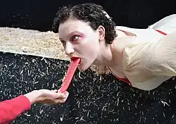 Carnesky also put on a stage show, in which she appeared as a lecturer presenting a condensed version of her research. The lecture was described by Maddy Costa as 'a playful survey of mythology and religion and art that has, over the centuries, attempted to capture and control the menstruating woman, harness her power for patriarchy's advancement.'[27] The Menstruants (Fancy Chance, Rhyannon Styles, MisSa Blue, H Plewis and Nao Nagai) appeared on stage and on film, enacting their rituals, 'a carmine carnival of sword-swallowing, body-sawing and hair-hanging, carnal in its original sense of human, of the flesh.'[27]