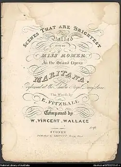 Maritana was first produced at the Theatre Royal, Drury Lane under Alfred Bunn's management on 15 November 1845, conducted on opening night by the composer. It was produced the following year in Dublin and Philadelphia, and soon afterwards in Vienna, with further performances in New York (1848, 1854, 1857, 1865 and 1868).[2] In 1873, Maritana became the first opera produced in England by the Carl Rosa Opera Company at Manchester. It was revived in Dublin in 1877, and in London at Her Majesty's Theatre in 1880, in an Italian version by Mattei. A performance in Denver, Colorado, in 1881, inaugurated the Tabor Grand Opera House.[3] A 1902 production was seen at Covent Garden.[4] It was produced again at the London Lyceum in 1925 and at Sadler's Wells in 1931, remaining popular until the middle of the 20th century.