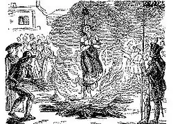Under English common law it was a petty treason until 1828, and until it was altered under the Treason Act 1790 the punishment was to be strangled and burnt at the stake.[3]