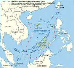 - The nine-dash line area claimed by the Republic of China (1912–1949), later the People's Republic of China (PRC), which covers most of the South China Sea and overlaps with the exclusive economic zone claims of Brunei, Indonesia, Malaysia, the Philippines, Taiwan, and Vietnam.