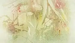After 12 years of study, Pigott was designated a Nanga master herself. With World War II looming, Pigott left Japan together with her sister Edith, arriving in Vancouver in 1940 and settling in Toronto. From 1955 to 1965 she taught the Nanga technique to Japanese in Canada. She started painting Canadian scenes, such as the landscapes around Muskoka,[3] using the Nanga technique and gradually developed her own style of semi-abstract wet-into-wet watercolour painting.[4]