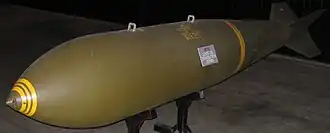 The M118 is an air-dropped general-purpose or demolition bomb used by United States military forces. It dates back to the time of the Korean War of the early 1950s. Although it has a nominal weight of 3,000 pounds (1,400 kg), its actual weight, depending on fuse and retardation options, is somewhat higher. A typical non-retarded configuration has a total weight of 3,049 pounds (1,383 kg) with an explosive content of 1,975 pounds (896 kg) of tritonal. This is a much higher percentage than in the more recent American Mark 80 series bombs thus the designation as a demolition bomb.