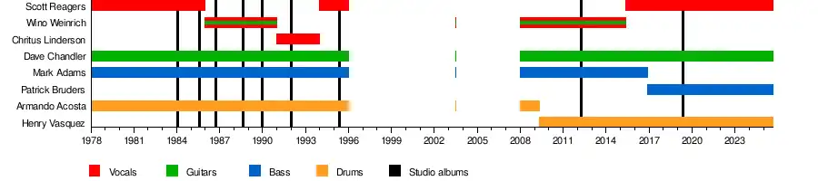 The original lineup consisted of Dave Chandler (guitar), Mark Adams (bass), Armando Acosta (drums) and Scott Reagers (vocals). They recorded their first two albums before Scott Weinrich replaced Reagers in 1986. The lineup of Chandler, Adams, Acosta and Weinrich is the longest-lasting. The third album Born Too Late (1986) is generally acknowledged as their best release.[8]