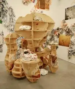 His paintings and sculptures made with fiberglass pieces, layered with rice paper, paint, silk-screens, and varying images and patterns, "explore dualities of culture and meaning."[2] The Museum of Fine Arts, Boston, Boston College Museum, Capital Children's Museum in Washington, DC, DeCordova Museum and Sculpture Park, and the Whitney Museum of American Art at Philip Morris, New York, New York.[2] He has received various public art commissions and grants from the Boston Medical Center, an Artist Fellowship Grant through the Massachusetts Cultural Council, and a Gund Travel Grant (Bali), and a special commission for the new Comme des Garçon store in New York City.[2]