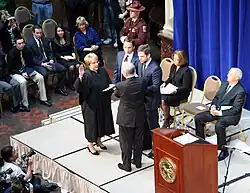 Dayton took the oath of office to become governor on January 3, 2011. Taking office a few weeks before his 64th birthday, he was the oldest person ever inaugurated as governor in Minnesota history.[40] Former Vice President and Senator Walter Mondale served as Master of Ceremonies at the inauguration. The first DFLer to serve as governor in 20 years, Dayton succeeded Republican Governor Tim Pawlenty. On January 5, Dayton signed two executive orders allowing the Minnesota Departments of Commerce and Health to apply for federal health-care grants and providing $1.2 billion in federal funds for an Early Option in a statewide Medicaid Opt-In program. These executive orders reversed the previous administration's ban on federal funding for the state health-care system.[41] In March 2011, Dayton signed a law increasing penalties on those who injure or kill police dogs.[42]