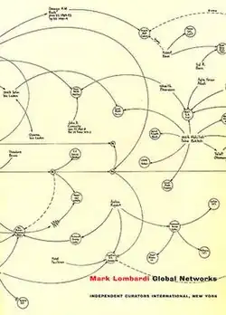 For instance, his 1999 drawing "George W. Bush, Harken Energy, and Jackson Stephens, ca 1979–90" shows alleged connections between James Bath, the Bush and bin Laden families, and business deals in Texas and around the world. Following Lombardi's suicide in 2000, the book Mark Lombardi: Global Networks was written in conjunction with a traveling exhibit.[4] The editors chose to incorporate into the cover artwork (see image at right) a detail from "George W. Bush, Harken Energy, and Jackson Stephens, ca 1979–90", showing George W. Bush (on the back cover of the book) and Osama bin Laden (in the upper left of the front cover) separated by one step from each other in the network, via Bath; the same connection between Bush and bin Laden was also highlighted in a 2003 Boston Globe article that described the FBI's interest in Lombardi's works immediately following the September 11 attacks of 2001.[8] Lombardi's diagrams map the illicit flow of capital, amounting to a creative form of story-telling or, arguably, financial true crime.[9]