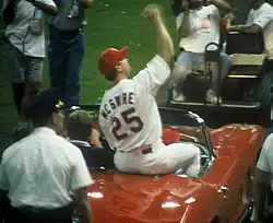 With the Cardinals in 1998, McGwire joined Cubs slugger Sammy Sosa in a chase for the single-season home-run record set by Roger Maris in 1961. McGwire surpassed Maris and finished with 70 home runs,[2] a record that Barry Bonds would break three years later with 73.[3]
