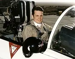 Mark Stucky was born in Minneapolis, Minnesota, to Paul and Lidia. He lived in Salina, Kansas during his childhood, where Paul taught physics at a local college.[3] Stucky's interest in aviation dates to 1974, when he began hang gliding off of cliffs.[4] He aspired to be a pilot and astronaut, goals which could be realized through entrance into military service. However, Paul was a Mennonite who believed in pacifism, and forbade his son to join the military. Stucky's interest in hang gliding led to a design project which resulted in a scholarship to study at Kansas State University; he graduated in 1980 with a B.S. in Physical Science. Stucky's desire to become a pilot was strong enough that he joined the United States Marine Corps, against his father's wishes.[3]
