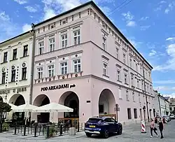 - Tenement at 9 Rynek Street: A two-story tenement with a Baroque-Classical facade topped by a high attic. Built in the mid-18th century after demolishing an earlier structure, it was rebuilt after a 1743 fire. A second story was added before 1800, but the attic was removed in the 1920s. A 1977–1979 renovation restored the attic.[24] A 2015 plaque commemorates Roman Dzieślewski, a pioneer of Polish electrical engineering.[25] It houses local offices of Radio Kraków and TVP Kraków. Listed in 1993.[12]