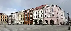 The Market Square remains Tarnów's most prominent public space, part of the downtown urban layout listed in the register of monuments.[5] The historic town hall stands at its center, surrounded by tenements built between the 16th and 19th centuries. The most significant are the Renaissance arcaded tenements in the northern row.[6] Every day at noon, the Tarnów hymn, composed by Stanisław Rzepecki, is played from the town hall tower.[7][8]