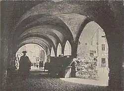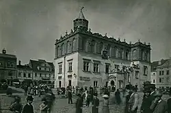 Throughout the 19th and early 20th centuries, the condition of the square's buildings improved, with renovated tenements receiving new Historicist facades. The town hall underwent a major renovation and reconstruction from 1889 to 1892.[2] The square's wells were closed between 1909 and 1910 after a new water system was built. Parts of the square were paved with river stones, likely from the 18th century, and between 1887 and 1888, the entire surface was repaved with river stone cobbles, with sidewalks added along all sides.[2] During the interwar period, no significant changes occurred. In 1931, the town hall was transferred to the museum after municipal offices relocated. In 1934, Tarnów's downtown, including the Market Square, was listed in the register of monuments.[2]