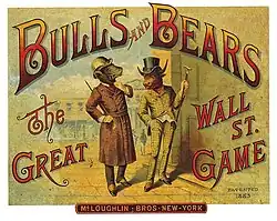 The terms "bull market" and "bear market" describe upward and downward market trends, respectively,[3] and can be used to describe either the market as a whole or specific sectors and securities.[2] The terms come from London's Exchange Alley in the early 18th century, where traders who engaged in naked short selling were called "bear-skin jobbers" because they sold a bear's skin (the shares) before catching the bear. This was simplified to "bears," while traders who bought shares on credit were called "bulls." The latter term might have originated by analogy to bear-baiting and bull-baiting, two animal fighting sports of the time.[4] Thomas Mortimer recorded both terms in his 1761 book Every Man His Own Broker. He remarked that bulls who bought in excess of present demand might be seen wandering among brokers' offices moaning for a buyer, while bears rushed about devouring any shares they could find to close their short positions. An unrelated folk etymology supposes that the terms refer to a bear clawing downward to attack and a bull bucking upward with its horns.[1][5]