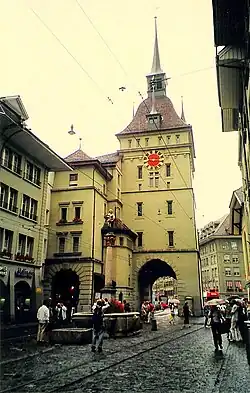 The Marktgasse is one of the streets in the Old City of Bern, the medieval city center of Bern, Switzerland. It is part of the Innere Neustadt which was built during the 13th Century. It runs from the Käfigturm between Waisenhausplatz and Bärenplatz in the west to the Zytglogge between Kornhausplatz and Theaterplatz in the east. It is part of the UNESCO Cultural World Heritage Site that encompasses the Old City.