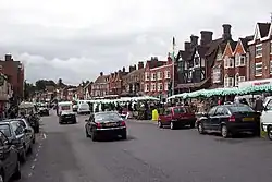 On 28 April 1653 the Great Fire of Marlborough started in a tanner's yard and spread quickly, eventually after four hours burning the Guildhall, St Mary's Church, the County Armoury, and 244 houses[13] to the ground.[14] This event attracted more than local attention; the parish register of Wotton-under-Edge, in the west of Gloucestershire, records on 9 August 1653 that 18 pounds 17 shillings and six and a half pence had been collected in the parish for the relief of the distressed inhabitants of Marlborough. During the rebuilding of the town after the Great Fire, the high street was widened and is often claimed to be the widest in England though the actual widest is in Stockton-on-Tees. This wide street allows ample space for the local market. Fire swept through the town again in 1679 and 1690. This time, an Act of Parliament was passed "to prohibit the covering of houses and other buildings with thatch in the Town of Marlborough".[15]
