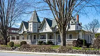 Marmaduke Forster House, also known as the Forster-Hobby-Washburn House, is an historic home located in Pleasantville, Westchester County, New York. The original section of the house was built about 1785 by Marmaduke Forster, a colonial carpenter from New York City, as a 1+1⁄2-story, timber frame dwelling. It was remodeled and enlarged in the 19th century, first about 1840 in the Gothic Revival style and again in 1895 by architect George P. Washburn.[2] This later modification added Queen Anne style elements - an octagonal turret on the front facade and a chateau wing with 20 colored glass panes. The house features a rambling 80-feet verandah with elaborate woodwork. The house was renovated in 2007, and a two-story addition built.[3] Currently it houses small business offices.
