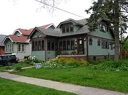 All the homes constructed by Karrels were trimmed in Craftsman style.[4] That style was popular for middle-class homes across the U.S. from about 1905 to 1930. Hallmarks are exposed rafter tails, broad eaves often supported on the ends by knee braces, and large porches supported by tapered square columns. Craftsman style was developed by the Greene brothers in California, influenced by the English Arts and Crafts movement. It was seen as a modern style at the time, not copying old European architecture like the Italianate and Queen Anne styles that preceded it.[6]
