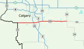 Highway 22X is a highway in and around Calgary in the Canadian province of Alberta, extending 54 kilometres (34 mi) to the east from Highway 22.[2] It is concurrent with Stoney Trail (Highway 201) between 53 Street SW and 88 Street SE in Calgary, becoming a freeway and forming the southernmost portion of a ring road around Calgary.