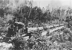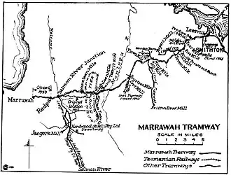 The Marrawah Tramway was a 28 miles (45.1 km) long narrow gauge forest railway near Marrawah in Tasmania with a gauge of 3 ft 6 in (1,067 mm).[1] The construction was initiated around 1911 to harvest timber in the Mowbray Swamp. The tramway was bought by the state government in October 1913 and the steel rails extended to Marrawah.[3] It was decommissioned in 1961.[4]