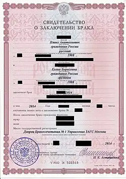 A certificate of marriage is the only legally valid document on the registration of marriage in Russia. Issued in the certification of the fact of state registration of the civil status act, signed by the head of the registry office and is sealed with its seal.[11]