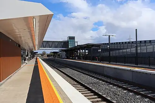 As part of Regional Rail Revival, the railway line between Waurn Ponds and South Geelong was duplicated, with a new second platform added to the station. The platform and station building closed on 15 June 2024 and were demolished.[10] On 26 August 2024, the rebuilt station opened to passengers.[10] The rebuilt station included a new station building on Platform 1 with an upgraded waiting room, a new second platform provided, a new pedestrian overpass, a new forecourt, upgraded car parking spaces, upgraded bus interchange, upgraded lighting, upgraded platform shelters and CCTV.[11][10] The duplication of the railway line was also completed on the same day.[10][11]