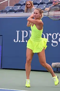 At the US Open, she beat former top-10 player Daria Kasatkina, in straight sets in the first round. She then beat former semifinalist and 31st seed Anastasija Sevastova.[17] In the third round, she met former champion and world No. 9, Naomi Osaka. She overcame a first set deficit by winning the second in a tie-breaker, but was beaten in the third.[18][19]