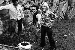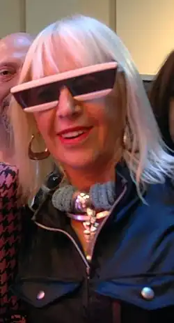 These works earned her a Guggenheim Fellowship in 1966, by which she relocated to New York City. The coup d'état by General Juan Carlos Onganía in June of that year made her fellowship all the more fortuitous, as the new regime would frequently censor and ban irreverent displays such as hers. Minujín delved into psychedelic art in New York, of which among her best-known creations was that of the "Minuphone," where patrons could enter a telephone booth, dial a number, and be surprised by colors projecting from the glass panels, sounds, and seeing themselves on a television screen in the floor.[10] The Minuphone was designed and constructed, in collaboration with her, by engineer Per Biorn, who was employed at Bell Telephone Laboratories, and the work was shown at the Howard Wise Gallery in New York City.[11] She was on hand in 1971 for the Buenos Aires premiere of Operación Perfume, and in New York, befriended fellow conceptual artist Andy Warhol.[7] Her image is included in the iconic 1972 poster Some Living American Women Artists by Mary Beth Edelson.[12]