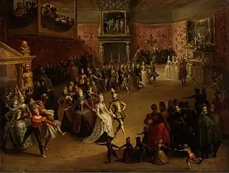 These small-scale compositions contain little figures with stereotyped faces and soft contours. This style is found in his allegories of the Five Senses (private collection), The ball and the Ball at the court (both in the Pushkin Museum, Moscow). This last composition is signed and dated 1604 and depicts an elegant dance party. The influence of early works by Hieronymus Francken the Elder and Frans Francken the Younger, who were both known for their depictions of similar scenes, is apparent.