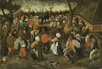 Van Cleve developed a number of new themes such as the King Drinks, the original of which is probably the painting sold at Kunsthandel Abels, Cologne in 1965. This theme invented by van Cleve became very popular in the next century.[8] His 'The good shepherd' was another original creation, which was widely imitated. Many Flemish artists, and in particular Pieter Brueghel the Younger, were inspired by these subjects.[11] Marten van Cleve is believed to have been an important influence on the development of Pieter Brueghel the Younger's style, along the more widely recognised precedent of his father, Pieter Bruegel the Elder.[4] The peasant wedding was a favourite theme of Cleve. He returned frequently to this subject depicting its various rituals and ceremonies, mostly in the form of cycles of small-scale panels. His Wedding Procession was widely copied by his workshop as well as Pieter Brueghel the Younger.[9] Another popular theme of van Cleve was The Massacre of the Innocents and his version of this subject was copied even more frequently than the version of Pieter Bruegel the Elder.[8] The attribution to van Cleve and his workshop of the various versions of the Massacre of the Innocents has been questioned on stylistic grounds, in particular on the basis of the fact that the more painterly handling of paint that is ascribed to van Cleve is missing in this body of work.[6]