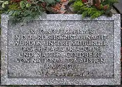 On the anniversary of the murder, that is to say on 10 November 2005, the artist Gunter Demnig from Cologne laid two "Stolpersteine" in memory of the Goldbergs in Burgdamm, in the pavement outside the house at 18 Bremerhavener Heerstraße (previously 144 Bahnhofstraße), where the Goldbergs lived and Adolph Goldberg's doctor's practice was based.[19] Demnig gave the brass top plate of the "Stolperstein" for Martha Goldberg the inscription shown below in translation: