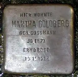 Martha Goldberg, née Sussmann (4 August 1873 – 10 November 1938) was a German woman and social activist, and one of five Jewish victims murdered by National Socialists in Bremen and the surrounding area during Reichspogromnacht. She was married to Dr Adolph Goldberg, also Jewish, whose practice was based in Burgdamm. Martha Goldberg was well respected due to her social conscience. For more than four decades she supported fellow citizens who were in need in a variety of ways, particularly those she encountered through her husband's medical practice. She and her husband were killed by a member of the Sturmabteilung.[1]
