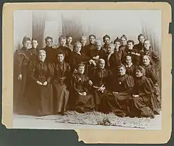 Martha Maria Hughes Cannon was born near Llandudno, Caernarfonshire, Wales on July 1, 1857, the daughter of Peter Hughes and Elizabeth Evans. She was known by the nickname "Mattie".[3] The Hughes family were converts to the LDS Church and emigrated to the United States with their two daughters, Mary Elizabeth and Martha Maria. They embarked from Liverpool, England on March 30, 1860, on the ship Underwriter and arrived in New York City, New York on May 1, 1860. Peter was very sick at the time and Elizabeth gave birth to their third child, Annie Lloyd. They stayed in New York to earn money to travel the plains to Utah territory. Erastus Snow, a church leader, invited the family to join a pioneer company funded by the LDS Church for the less fortunate. The family accepted the invitation and traveled by train to Florence, Nebraska, and left with the Joseph Horne company on July 11, 1861. Shortly before the family's arrival in the Salt Lake Valley, on September 3, 1861, Martha's sister, Annie Lloyd Hughes, died and was buried in an unmarked grave. She was 21 months old. The Joseph Horne company arrived in the Salt Lake valley on September 13, 1861. Three days after they arrived in Salt Lake City, on September 17, 1861, Peter Hughes died. Elizabeth Hughes was left a widow with two young daughters at the age of 28.[1]: 4–8 Thirteen months later, Elizabeth married James Patten Paul, a widower with four sons, and they were the parents of university professor and newspaper editor Joshua Hughes Paul.[4] After Elizabeth's marriage to James P. Paul, Martha, at different times in her life, went by the surnames of both Paul and Hughes. Later in life, Paul encouraged Martha to follow her dream of becoming a medical doctor.[1]: 9–12