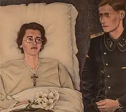On 25 March 1922, according to the testimony of her sister Alice, Robin had a personal vision of the Virgin Mary.[21] Following the testimonies gathered by the 1986 diocesan enquiry, this vision was followed by others.[21] She reported that Christ appeared to her on the night of 4 December 1928. She confided about this vision to Père Faure, her parish priest, then took the decision to give her life entirely to God and to unite herself with his sufferings through prayer and love.[22] From then on, her spiritual life was more and more centered on the Passion of Christ and the Eucharist. She received regular visits from several local priests.[23]
