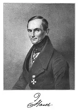 Mandt was born in Beyenburg, Wuppertal, to surgeon Martin and Franziska née Conet. The family later moved to Remscheid. He studied at home before going to grammar school in Düren (1813–1816). He studied medicine from his father and served as a military doctor in Aachen between 1816 and 1817. He then went to Berlin where he studied under Karl Asmund Rudolphi (1771-1832), Martin Hinrich Carl Lichtenstein (1780-1857) and Johann Nepomuk Rust (1775-1840). He worked in Prussian military hospitals at various times and in 1820 he transferred to the Gardeartilleriebrigade in Berlin. He became a ship doctor aboard the whaler Blücher to Greenland and Spitzbergen under the English captain John Rose the next year. He became interested in Arctic mammals and wrote a dissertation in 1822 titled Observationes in historiam naturalem et anatomiam comparatam in itinere Groenlandico factae and passed the state examination in 1824. From 1825 he worked in Küstrin as a district physician. He also became a member of the local Freemasonry. In 1830 he became a teacher of medicine at Greifswald in a clinic of his own. In 1832 he made a six-month journey through Germany, Italy, France and England during which time he examined the state of asylums and the treatment of insanity.[1] He published several notes on the treatment of diseases and on new surgical methods. He accompanied the Grand Duchess of Russia (Helena Pavlovna) who had been advised to visit German baths by Rust. In 1836 he moved to Saint Petersburg. From 1840 he became personal physician to Tsar Nicholas I (1796-1855) and the Tsarina Alexandra Fedorovna. He treated the dying Tsar who suffered from a terminal lung infection, staying by his bed right until the time of his death.[2] He later worked as a lecturer and in 1841 became a professor of therapy at the Imperial Medico-Surgical Academy in 1845 at Saint Petersburg. During the cholera epidemic of 1848-49 he used a controversial method of treatment called the "atomistic system", related to homeopathy.[3] In 1855 he was elected to the Leopoldina Academy. He returned to Frankfurt on the Oder in 1856 and died there in 1858.[4][5][6]