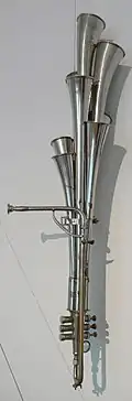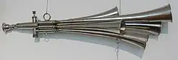 The Martinshorn (also known as the Martin's trumpet and Schalmei) is a German free reed aerophone created in 1880 by Max Bernhardt Martin, who was also the main manufacturer of the instruments.[1] The Martinshorn contains several reeds, each of which having its own horn.[2] The instrument was created in imitation of the saxhorn.[3] The horn can be confused with the shawm, as they are both referred to by the name "Schalmei"; the origins of the similar naming is unknown.