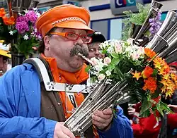 The schalmei was popularised as an instrument in the 1920s by the German Communist Party, inspired by the Wanderbewegung, movement played in bands consisting of 20-30 members.[5] This was particularly effective in the Saarland, where bands were often formed by groups of unemployed coal miners.[6] During the Second World War, many Martinshorns were destroyed by the Nazi Party, under the impression that the instruments were a symbol of Marxism.[4] However, in some parts of Germany, they were used extensively by the Hitler Youth, who, due to their ease of playing and loudness, used them to rally crowds to spread propaganda.[7]