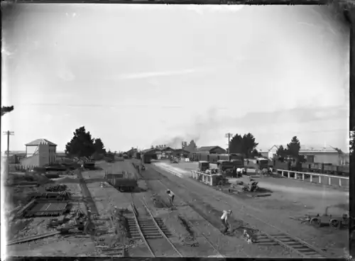 The line from Whanganui to Turakina opened on Thursday 17 May 1877,[7] declared a public holiday by Whanganui's mayor.[8] Stewart & Co built the extension from Turakina to Marton.[9] The earthworks to Marton were said to be completed by the end of 1876.[10] However, trains weren't extended south until 4 February 1878.[11] Two months later there was criticism that Marton station was too small[12] and too far from the town;[13] in 1875 there had been a plan for the station to be 8 chains (530 ft; 160 m) further east, which would have been closer to the town centre.[14]