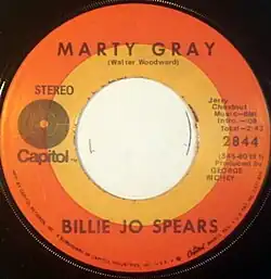 "Marty Gray" was released as a single by Capitol Records in June 1969. It was backed on the B-side by a cover of Cole Porter's "True Love". It was distributed as a seven-inch vinyl record.[6] The track entered the American Billboard Hot Country Songs chart in July 1970. Spending 14 weeks there, it peaked at number 17 in September 1970. It became the second song of Spears's to enter the Billboard top 20.[7] On Canada's RPM Country Tracks survey, the song reached the number 27 position. It was her third charting single in Canada.[8] "Marty Gray" was included on Spears's 1970 studio album titled Country Girl.[9]